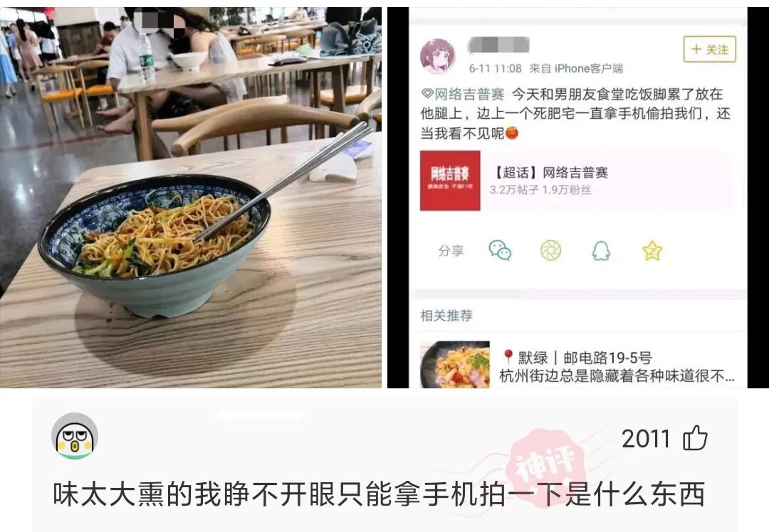今天和男朋友食堂吃饭脚累了放在他腿上,边上一个死肥宅一直拿手机偷拍我们, 还当我看不见呢?大家说我应该如何反驳她?