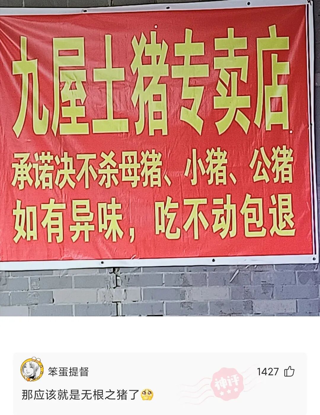 本店郑重承诺决不杀母猪,小猪,公猪,如有异味,吃不动包退!大家都可放心购买!