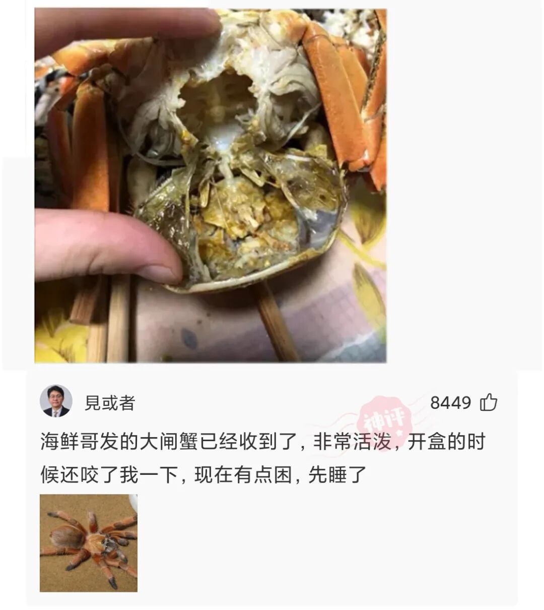 买了8只螃蟹,两个死了,一点肉都没,感觉不是路上死的,而是发货就是死的,味还真臭,那味道跟盐城大丰蒋志成的脚似的!