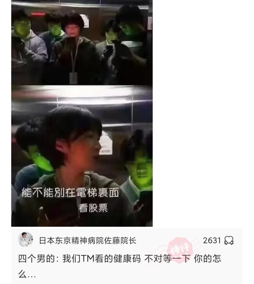 能不能别在电梯里面看股票?你们的脸都绿了!