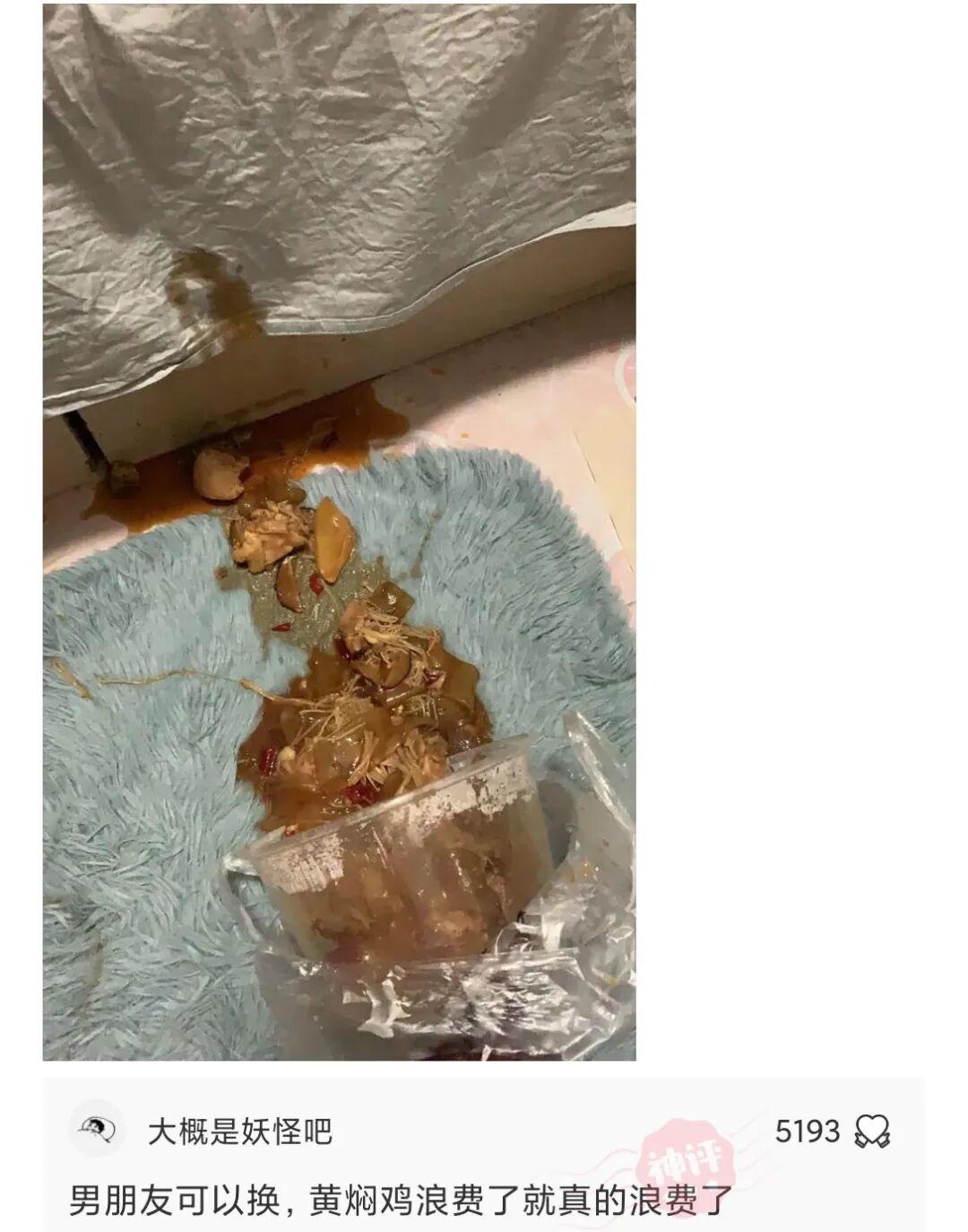 跟男朋友吵架,他一气之下把我的黄焖鸡给打翻了,地毯也弄成这样,我想问下各位逗包,如果是你们会怎么办?