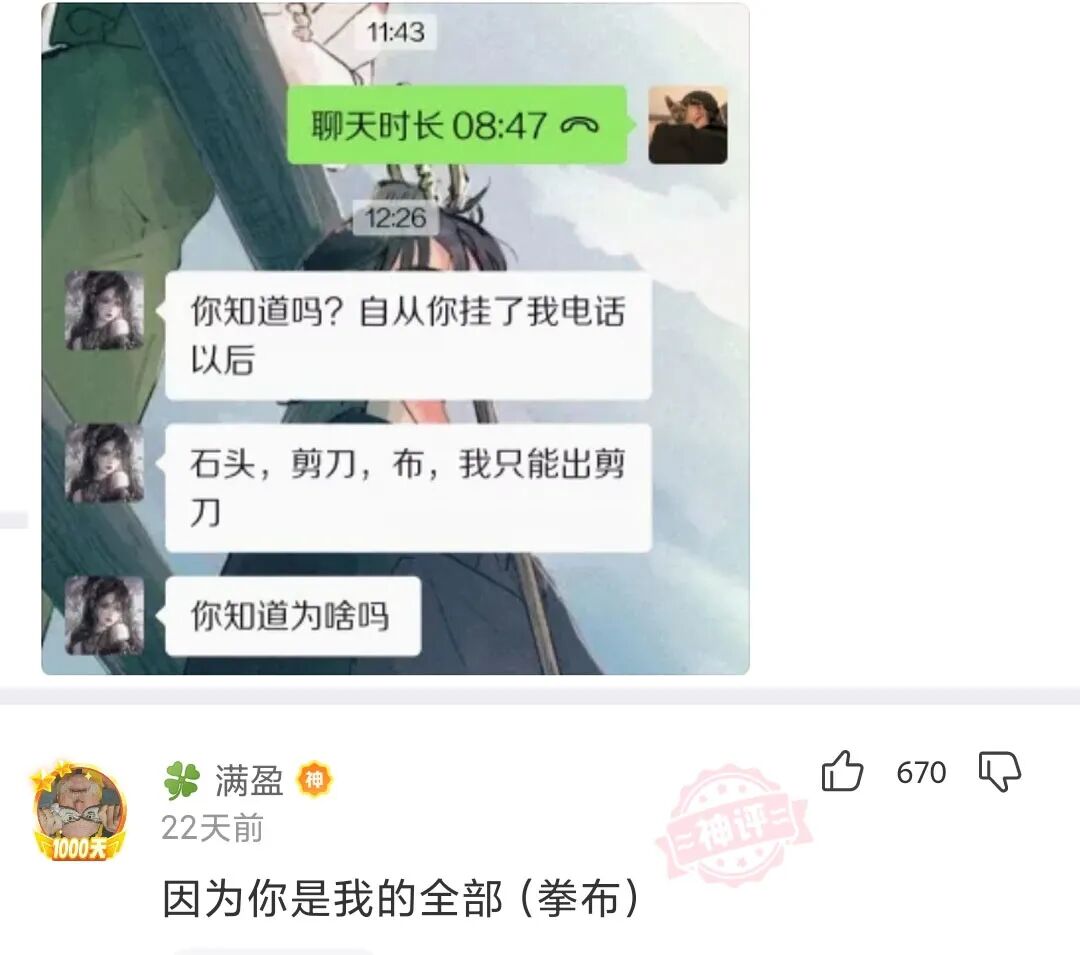 你知道吗?自从你挂了我电话以后,石头,剪刀,而,我只能出剪刀,你知道为啥吗?