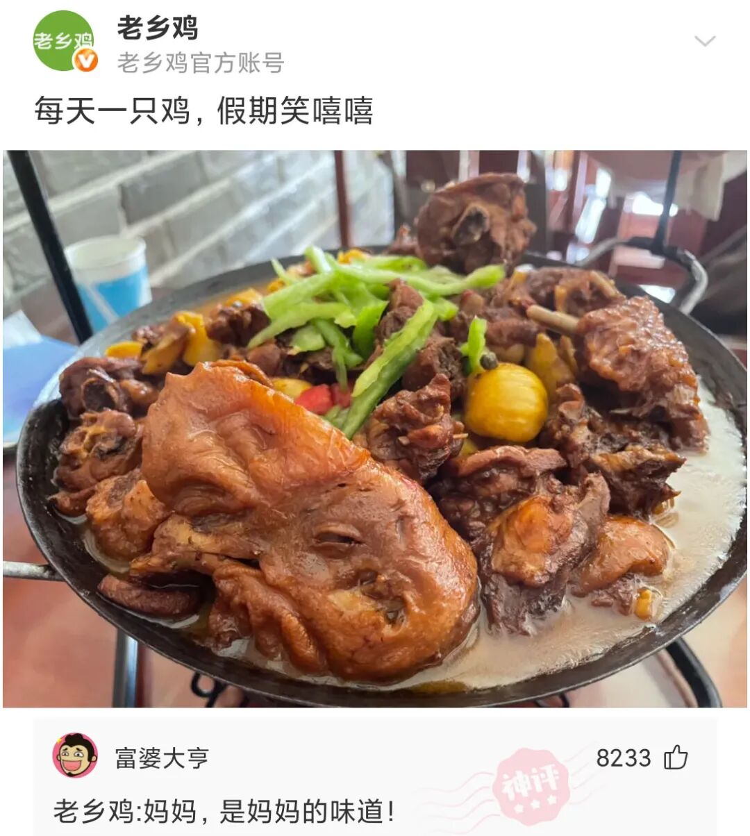 老乡鸡:每天一只鸡,假期笑嘻嘻!