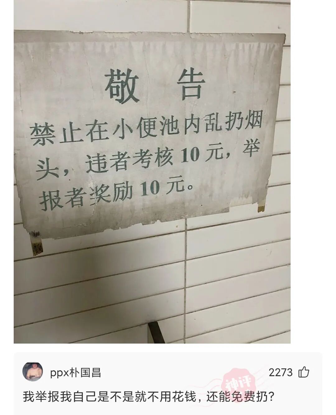 敬告:禁止在小便池内乱扔烟头,违者考核10元,举报者奖励10元。