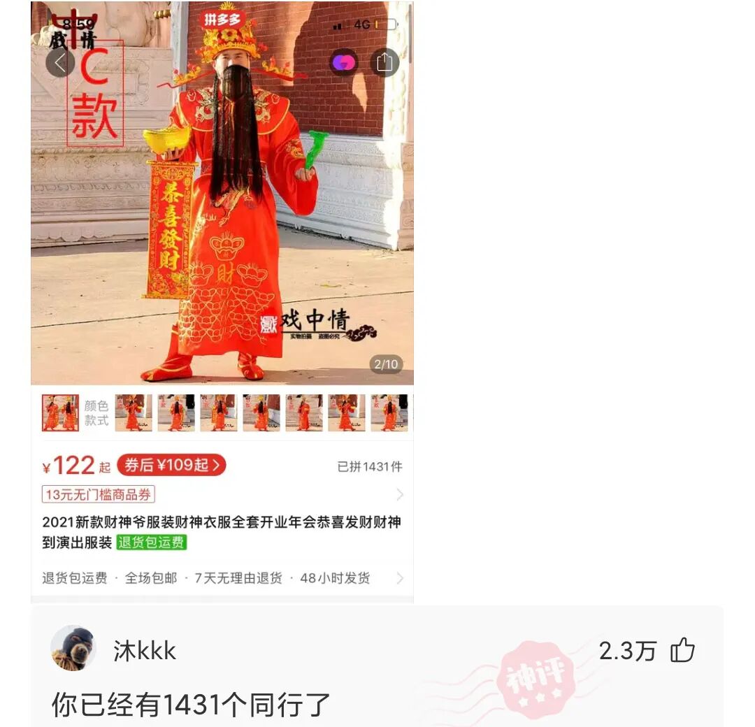 我想到一个小商机,穿着这套衣服,一个一个的店铺去说几句恭喜发财的话,一天下来千儿八百应该有的,你们觉得怎么样?
