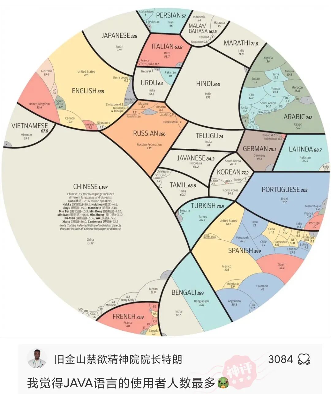 世界上目前有7,000多种已知的语言在使用中。下图显示了各种语言的使用者人数对比。