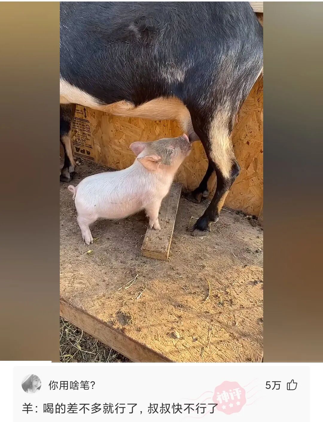 没有妈妈的小猪,跑来羊妈妈这里蹭奶喝!