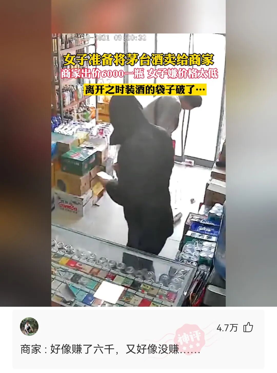 女字准备将茅台酒卖给商家,商家出价6000一瓶,女子嫌价格太低没有卖,离开之时装酒的袋子破了。。。撒了一地。。。。。