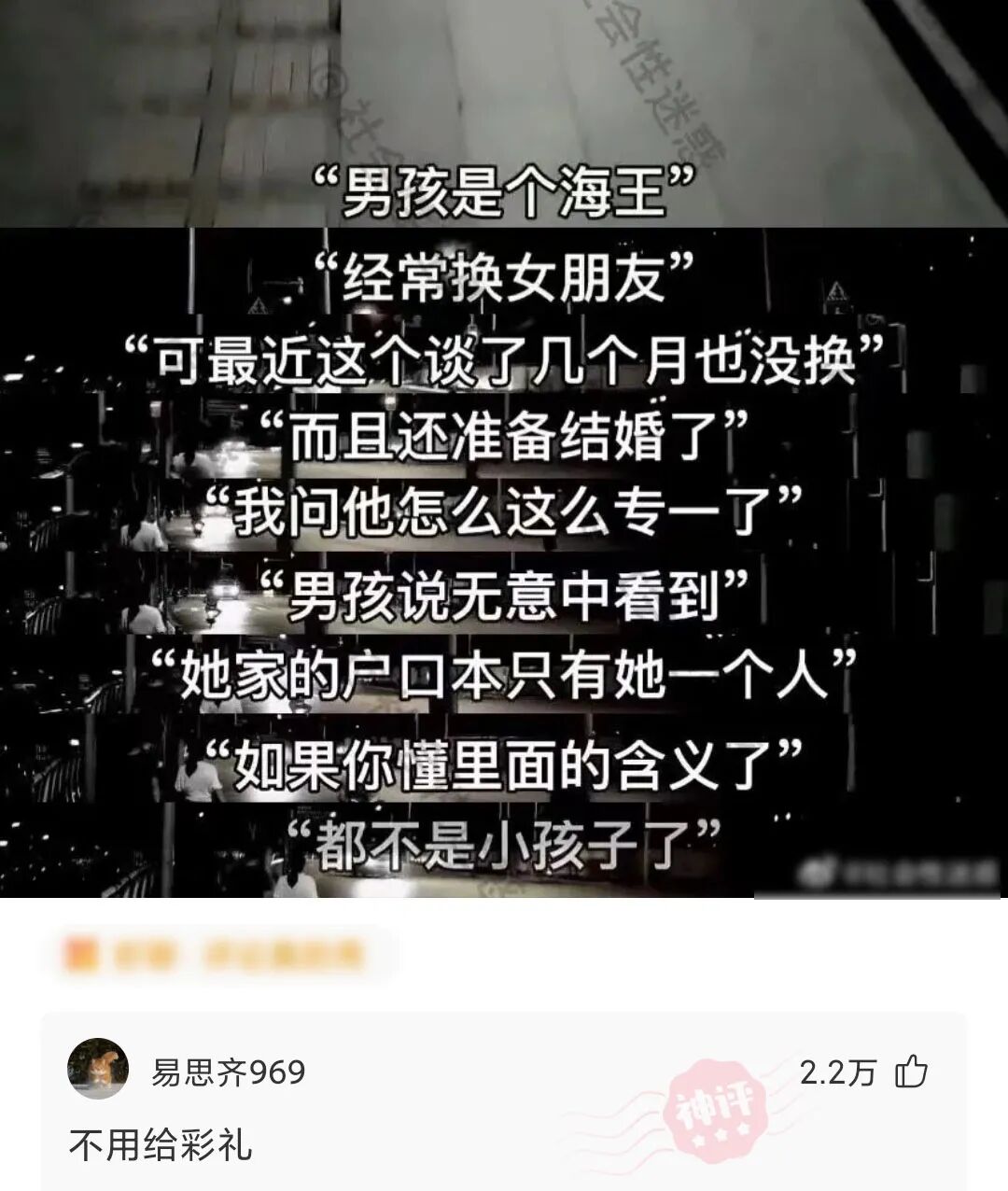 男孩是个海王,经常换女朋友,可最近这个谈了几个月也没换,而且还准备结婚了,我问他怎么这么专一了,男孩说无意中看到的,她家的户口本就只有她一个人,如果你懂里面的含义了,都不是小孩子了。