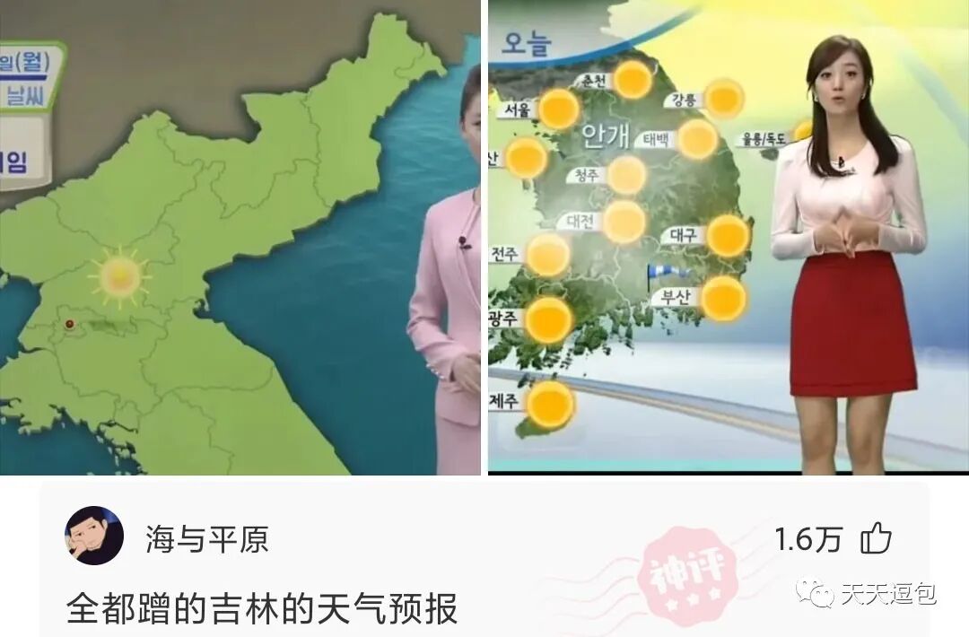 我很好奇,图一朝鲜天气预报和图二韩国天气预报,为什么不直接一起播报?