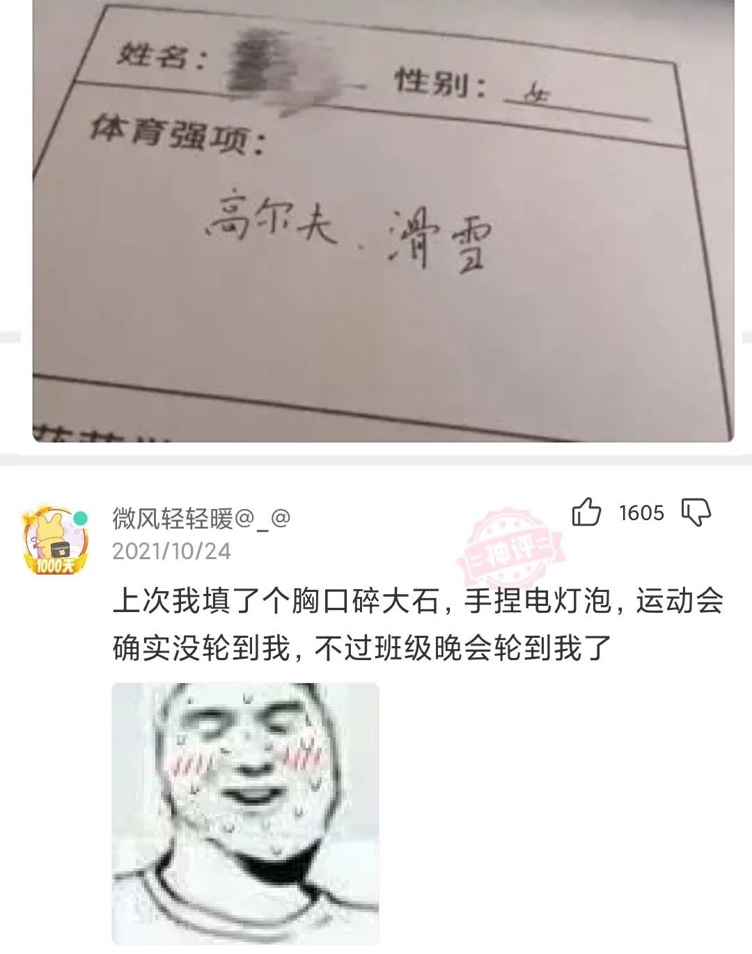 【沙雕问题3】听学长说,新到学校写体育强项的时候,千万不要写运动会用得到的项目,不然,就会被强制参加,后来我想了想,就这么写……