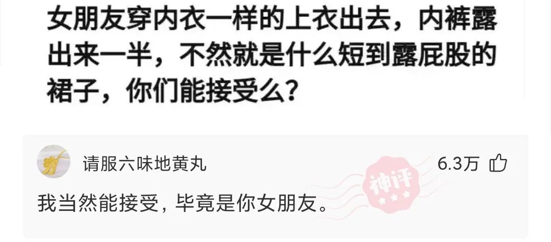 【沙雕问题12】女朋友穿内衣一样的上衣出去,内裤露出来一半,不然就是什么短到露屁股的裙子,你们能接受么?