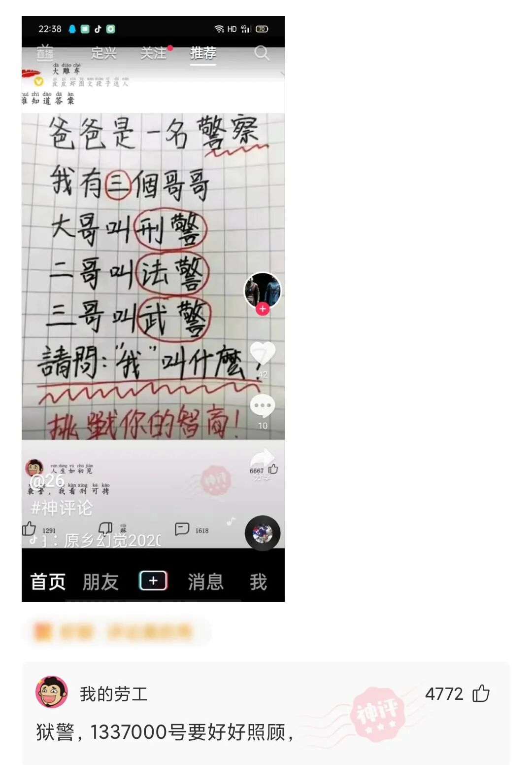【沙雕问题14】兄弟们,我爸爸是一名警察,我有三个哥哥,大哥叫刑警,二哥叫法警,三哥叫武警,请问:“我”叫什么?