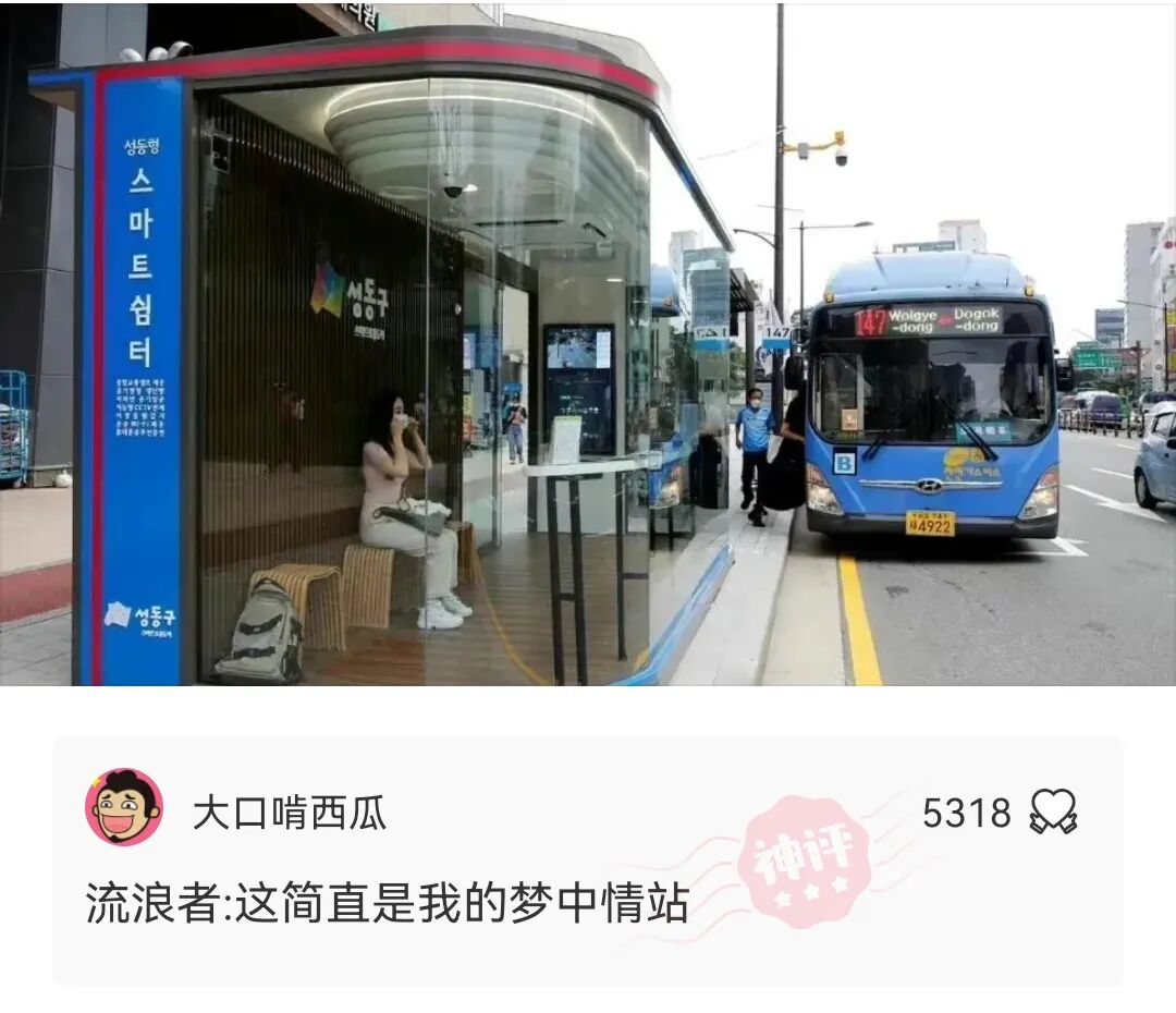 韩国的公交站真不错,美观又实用,可以遮阳挡雨,候车室里面还装了空调。
