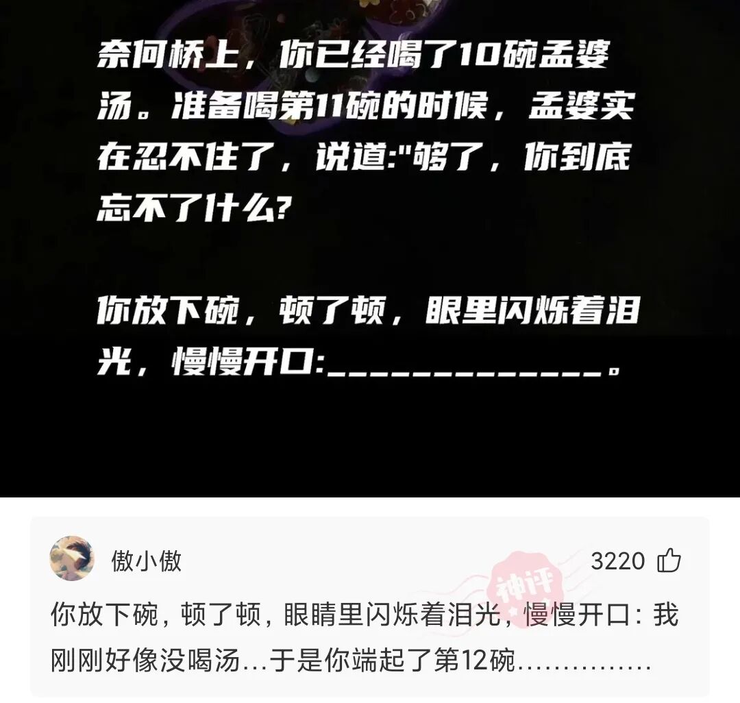 【沙雕问题2】奈何桥上,你已经喝了10碗孟婆汤。准备喝第11碗的时候,孟婆实在忍不住了,说道:“够了,你倒底忘不了什么?”。你放下碗,顿了顿,眼里闪烁着泪光,慢慢开口:__________.