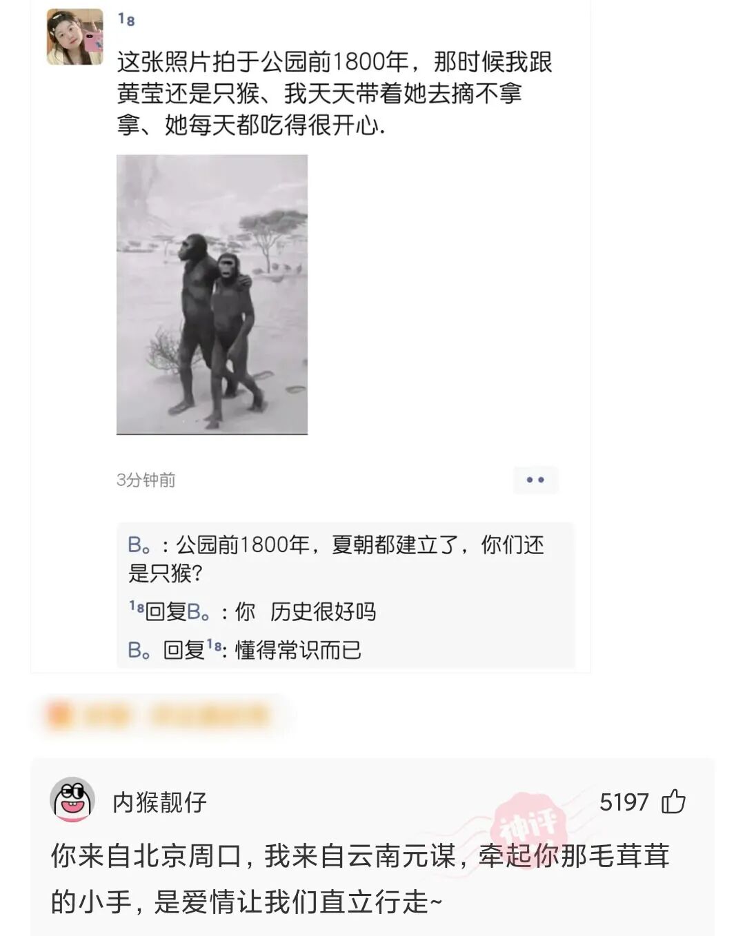 【沙雕问题3】这张照片拍于公元前1800年,那时候我跟黄莹还是只猴、我天天带着她去摘不拿拿、她每天都吃得很开心。