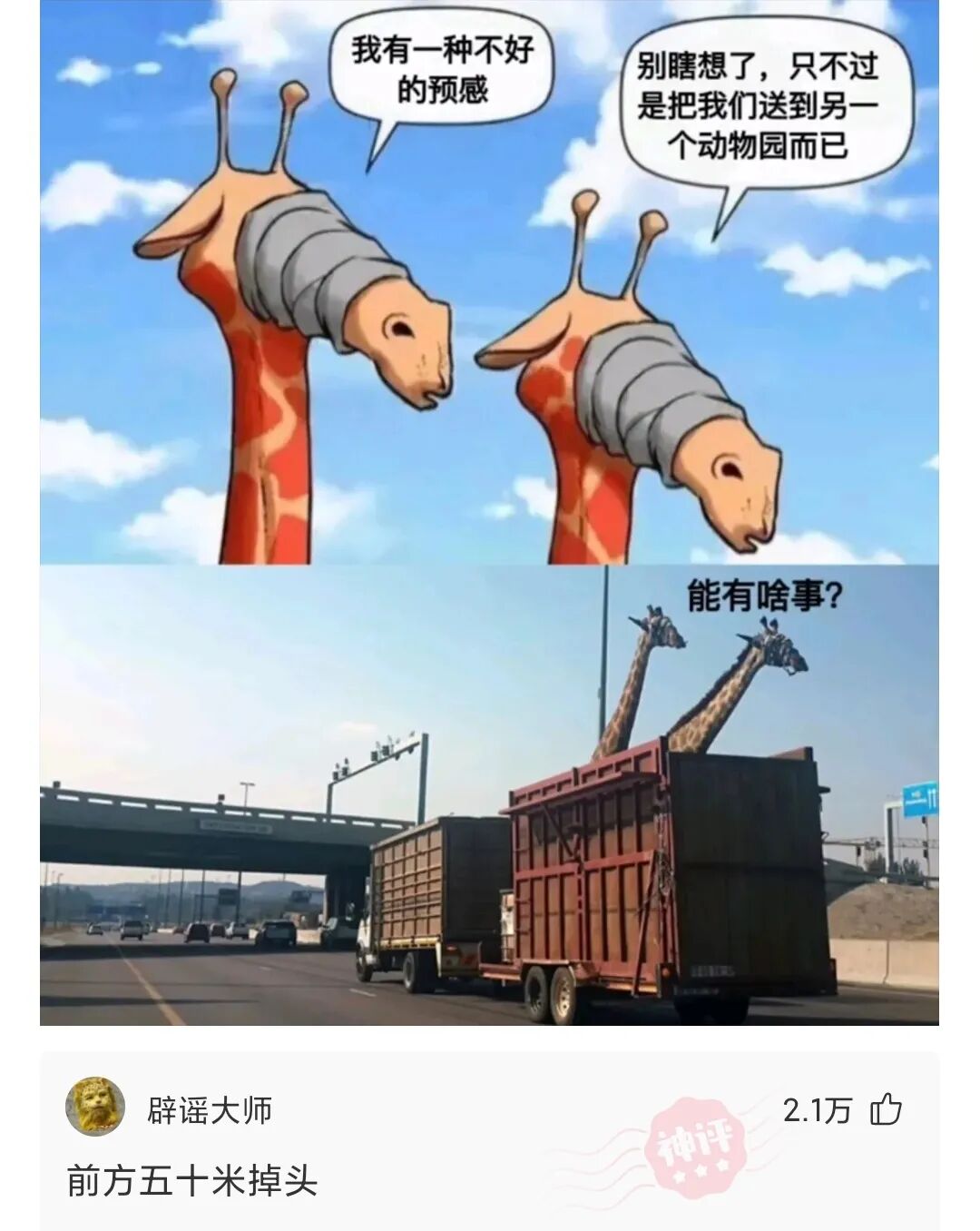 长颈鹿B:别瞎想了,只不过是把我们送到另一个动物园而已!