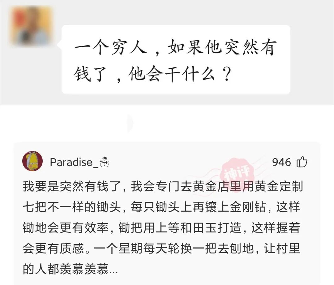你们说,一个穷人,如果他突然有钱了。他会干什么?