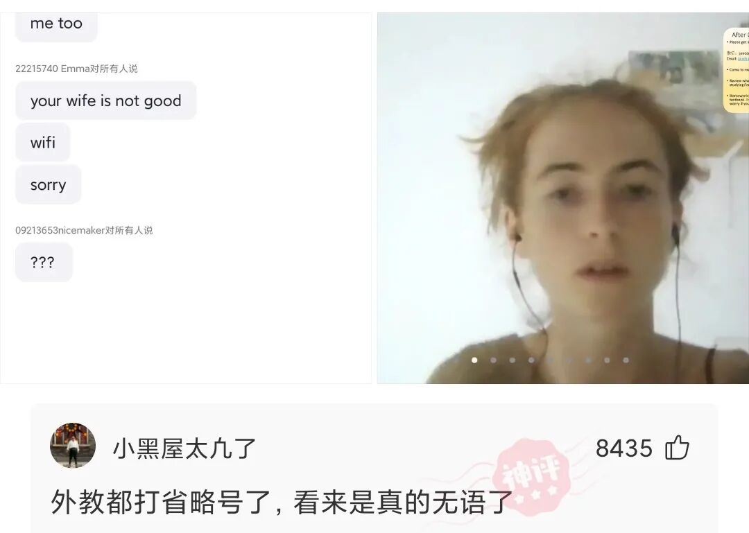 今天在英语口语课上,一个同学的发言,把外教老师给整尴尬了,看老是呆蒙的样子,好可爱!