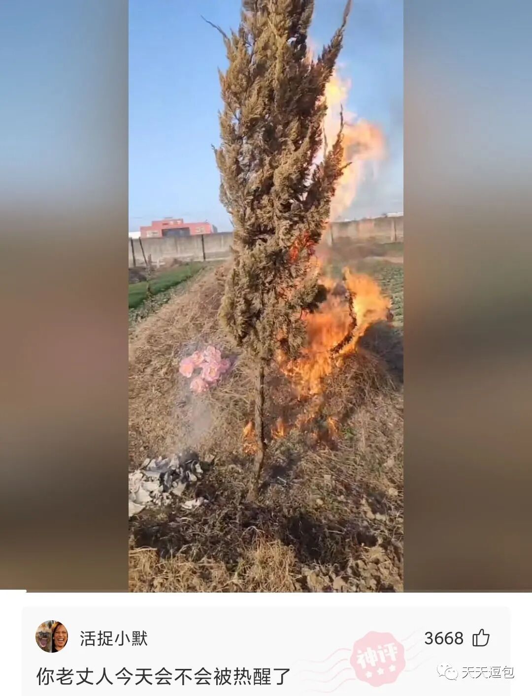 给老丈上坟,不小心把坟头标记树给烧了,下次媳妇会不会哭错坟头吧!