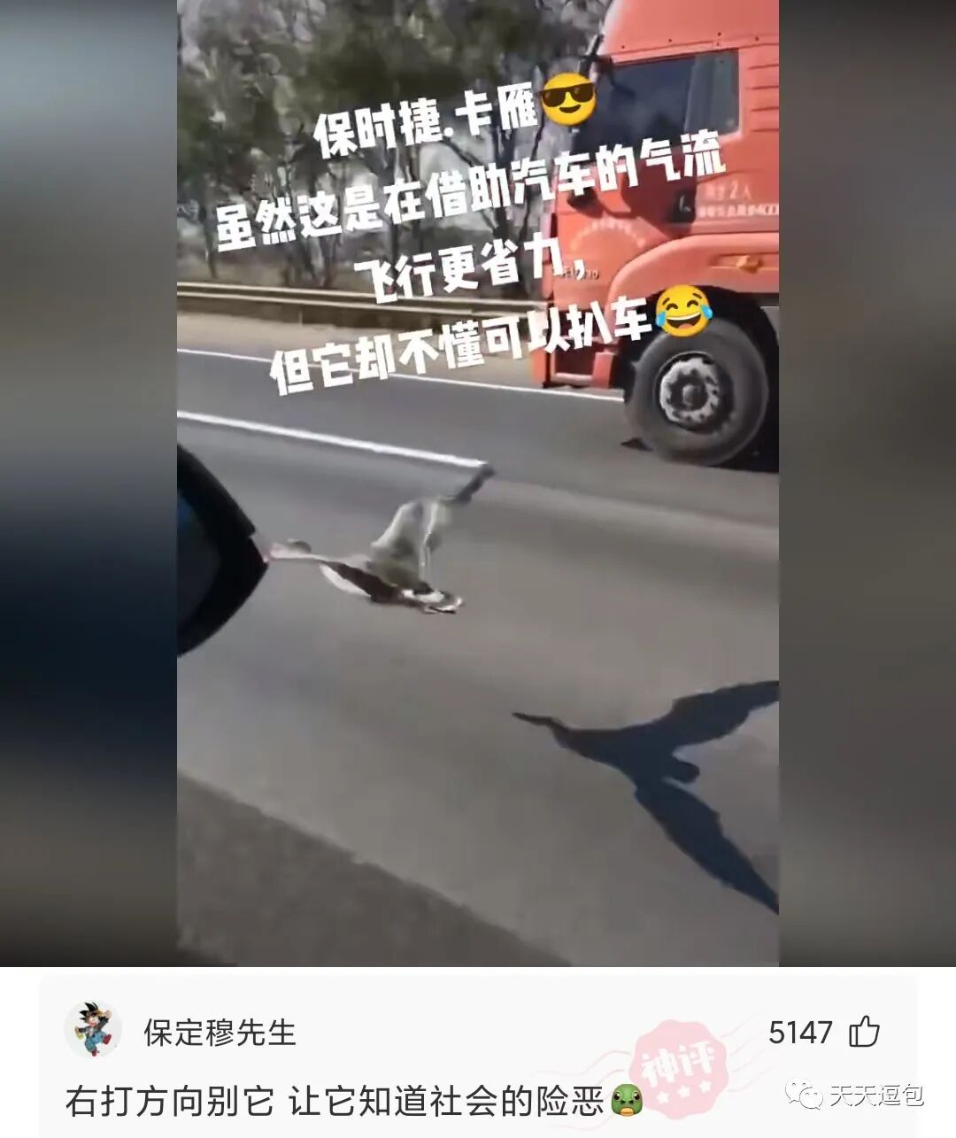 保时捷卡雁,虽然这是在借助汽车的气流飞行更省力,,但它却不懂得趴车上更省力!
