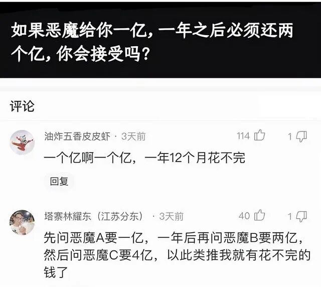 如果恶魔给你一-亿,一年之后必须还两个亿,你会接受吗?
