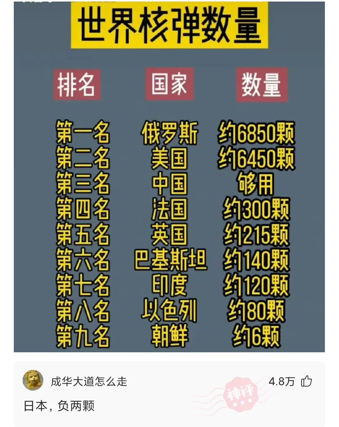世界核弹数量一览,后四名为非法拥有!