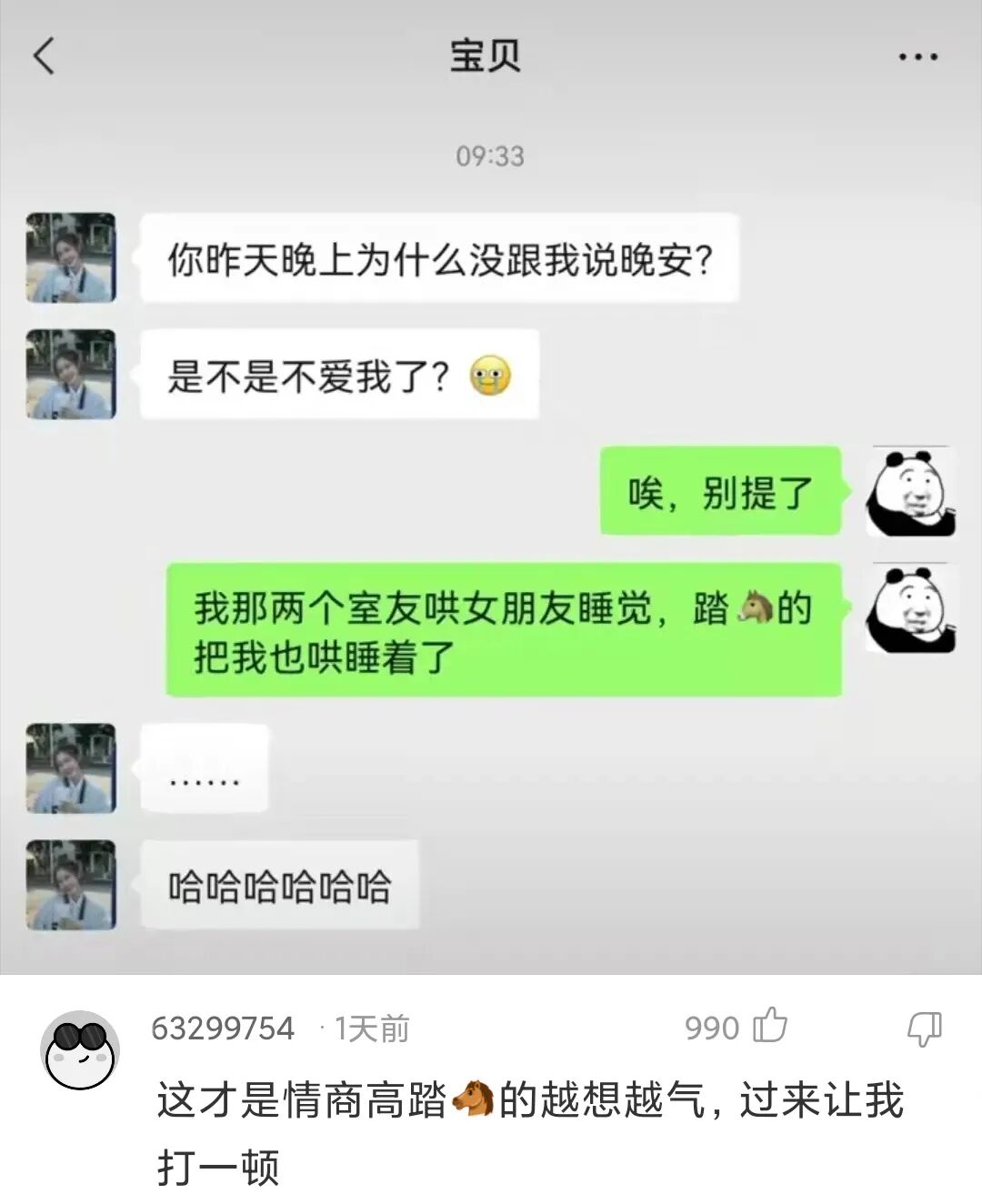 神回复:你清高!你了不起!你让三百斤的她把我拖走!