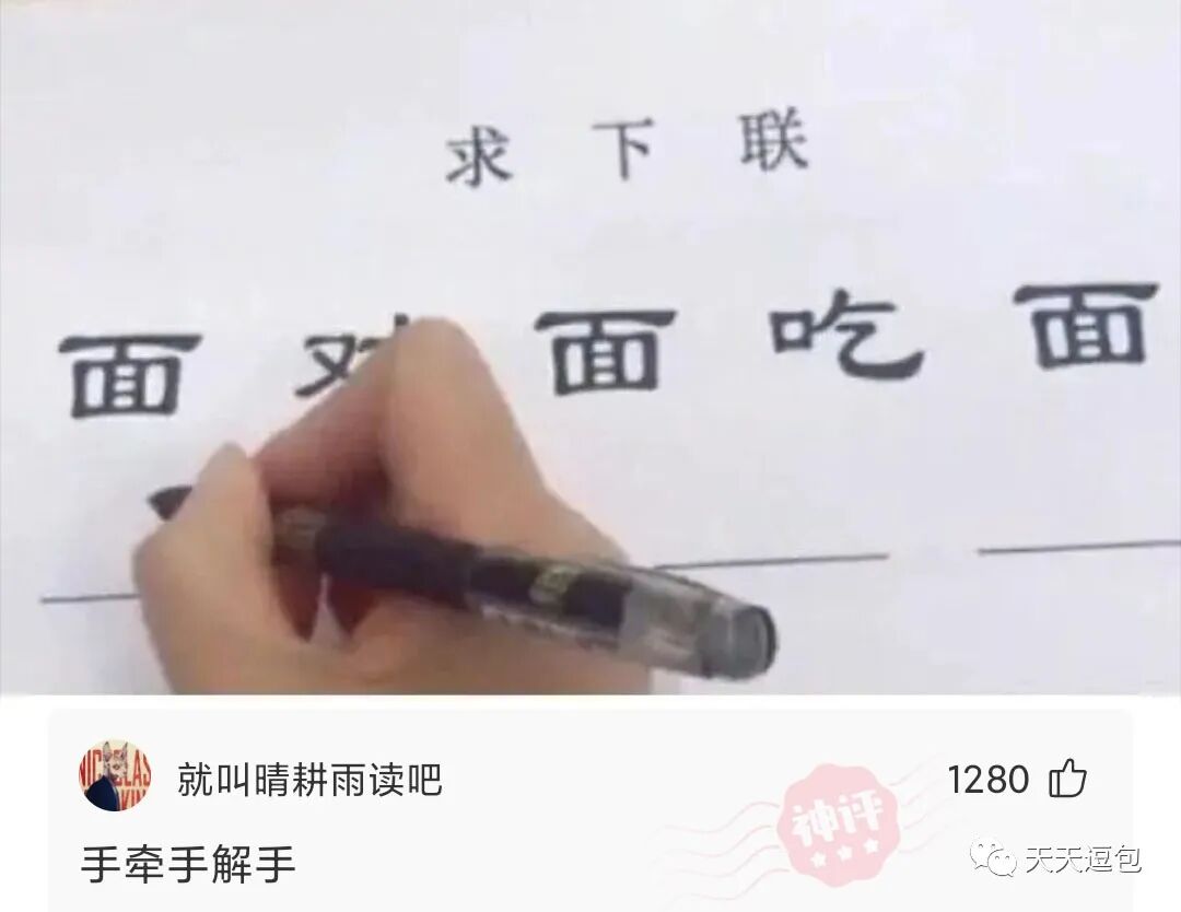 兄弟们,来对对联了,我先来:心连心贴心,嘴对嘴亲嘴。该你们了!
