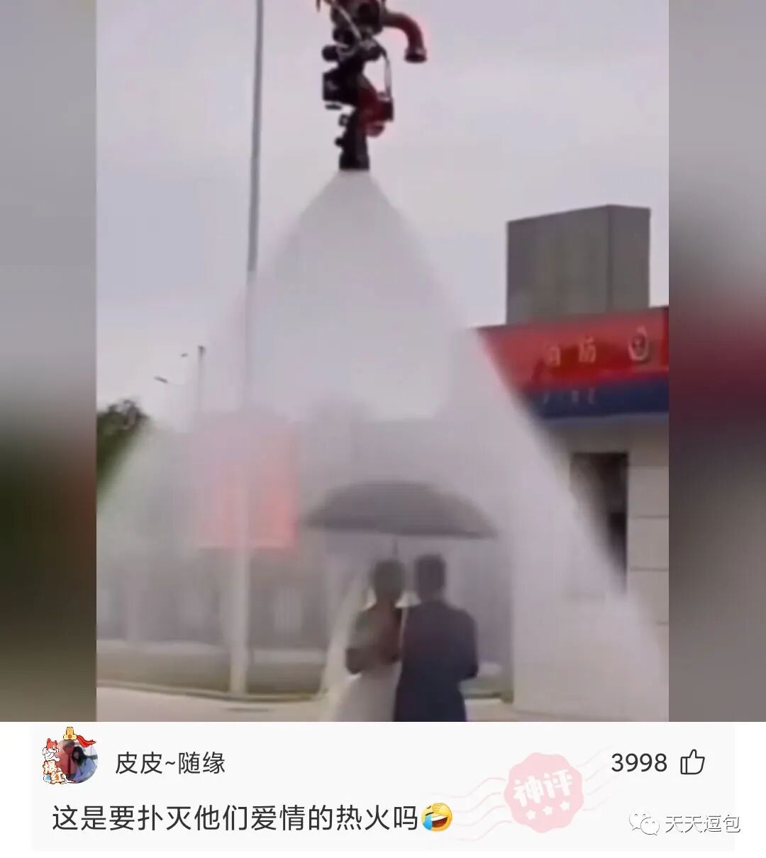 消防员浪漫求婚现场,结果战友用力过猛,水喷大了。。。
