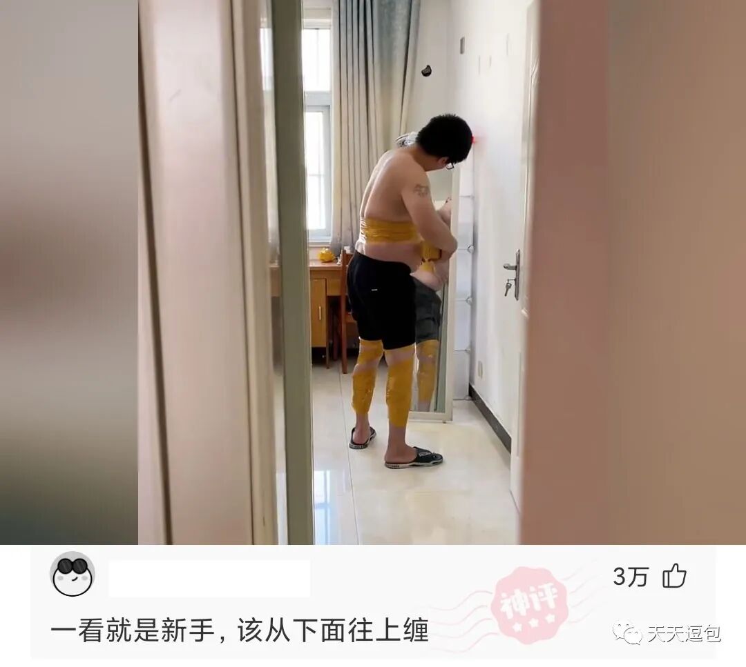 朋友参加同学聚会,竟然用胶带缠肚子和小腿。