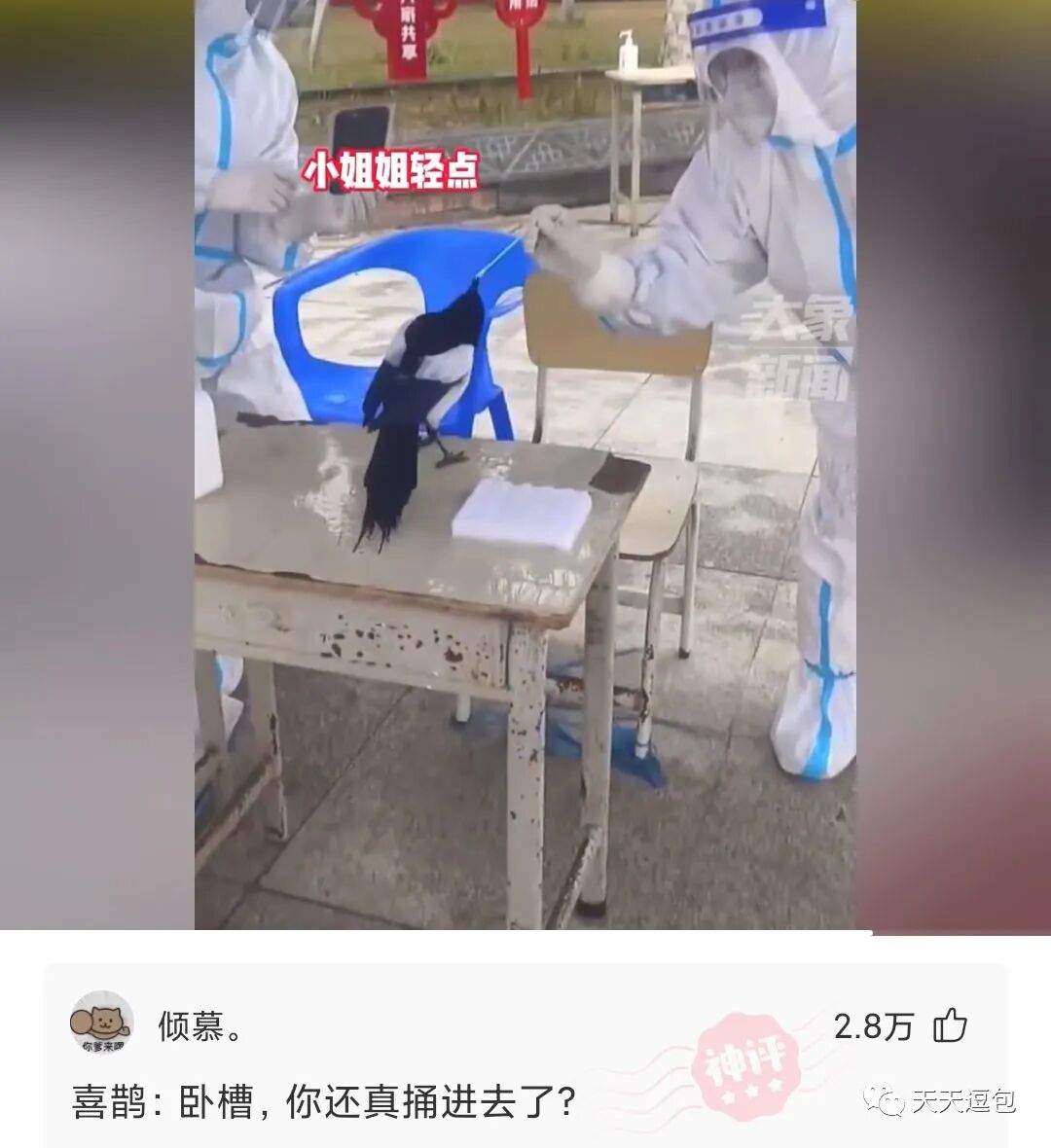 市民上午做核酸时,发现喜鹊也跟着做“核酸”。