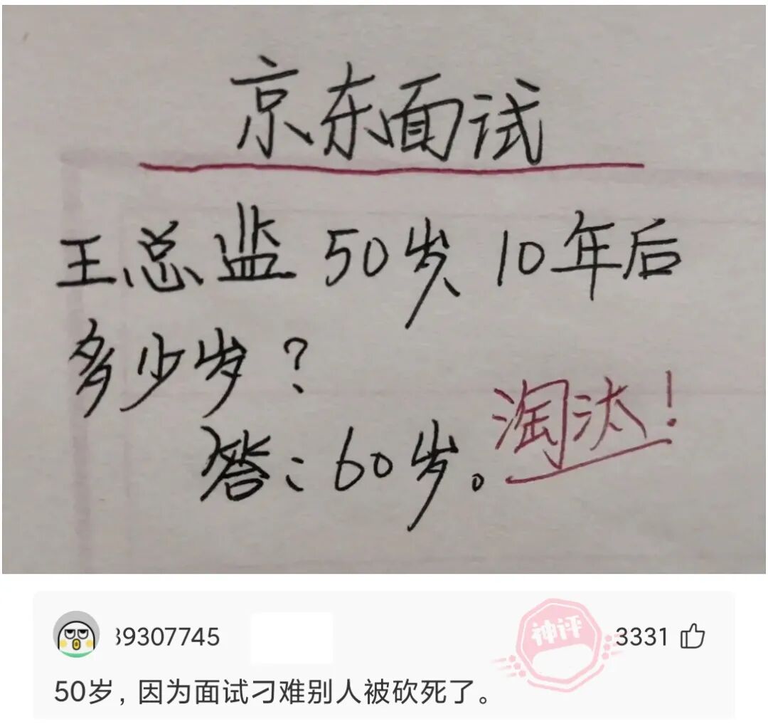 一道京东面试题很有趣:王总监50岁,10年后多少岁?答60岁的居然都被淘汰了,究竟是什么原因?