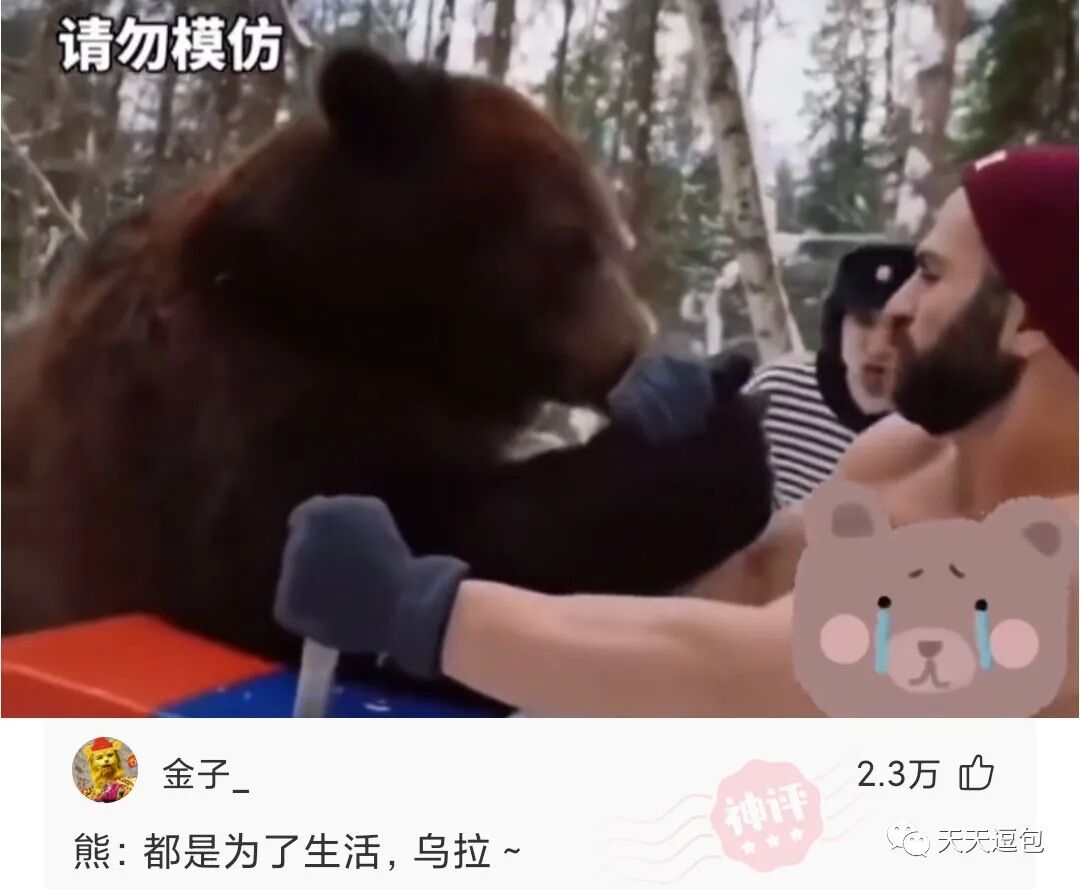 俄罗斯的熊真不容易,为了混口饭吃,还要向人类低三下次,不说了,还要陪这个大胡子掰手腕,我可不能赢了他。。。