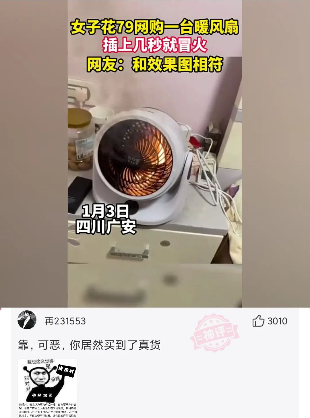 一女网友花79网购台暖风扇,在插上几秒就冒火,网友:这么诚实的卖家实属不多了!