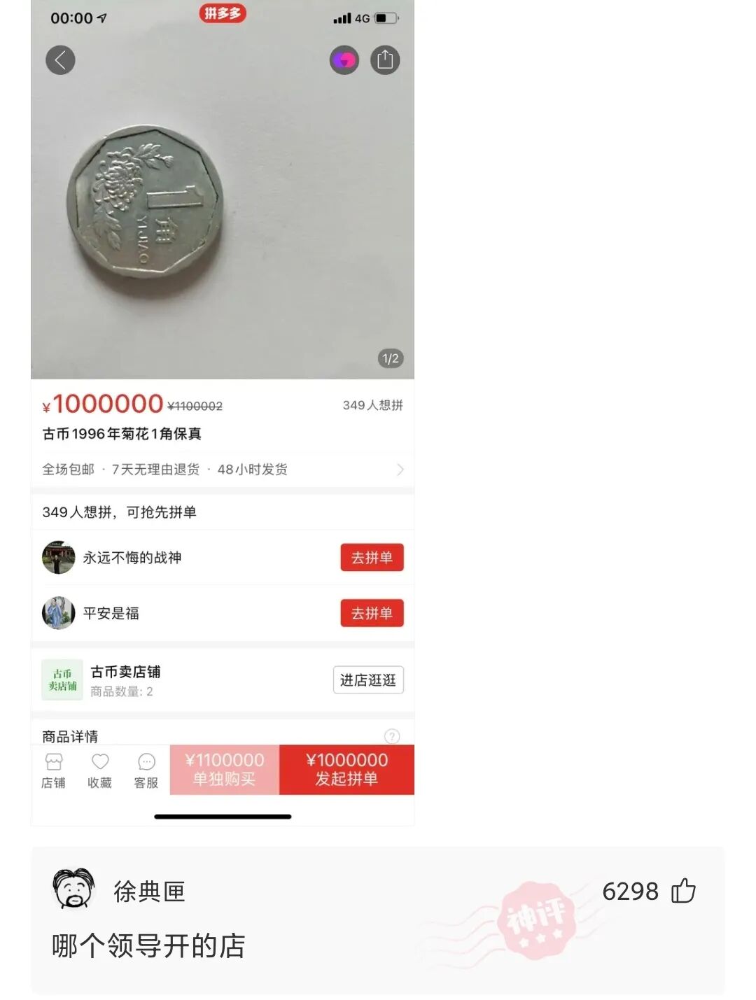 96年的1毛硬币,现在已经可以称之为古币,现价一百万一枚,单独购买一百一十万,特么的,这还有人想拼单,拼多多YYDS!