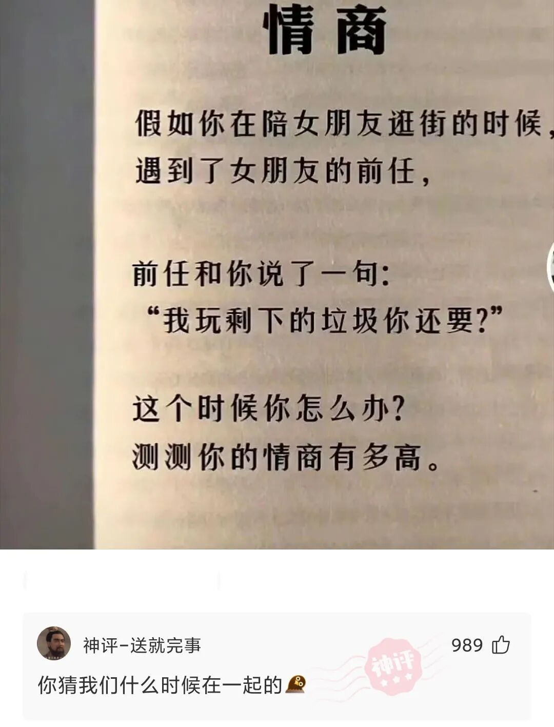 假如你在陪女朋友逛街的时候,遇到了女朋友的前任,前任和你说了一句:“我玩剩下的垃圾你还要?”,这个时候高情商的你会如何回答呢?