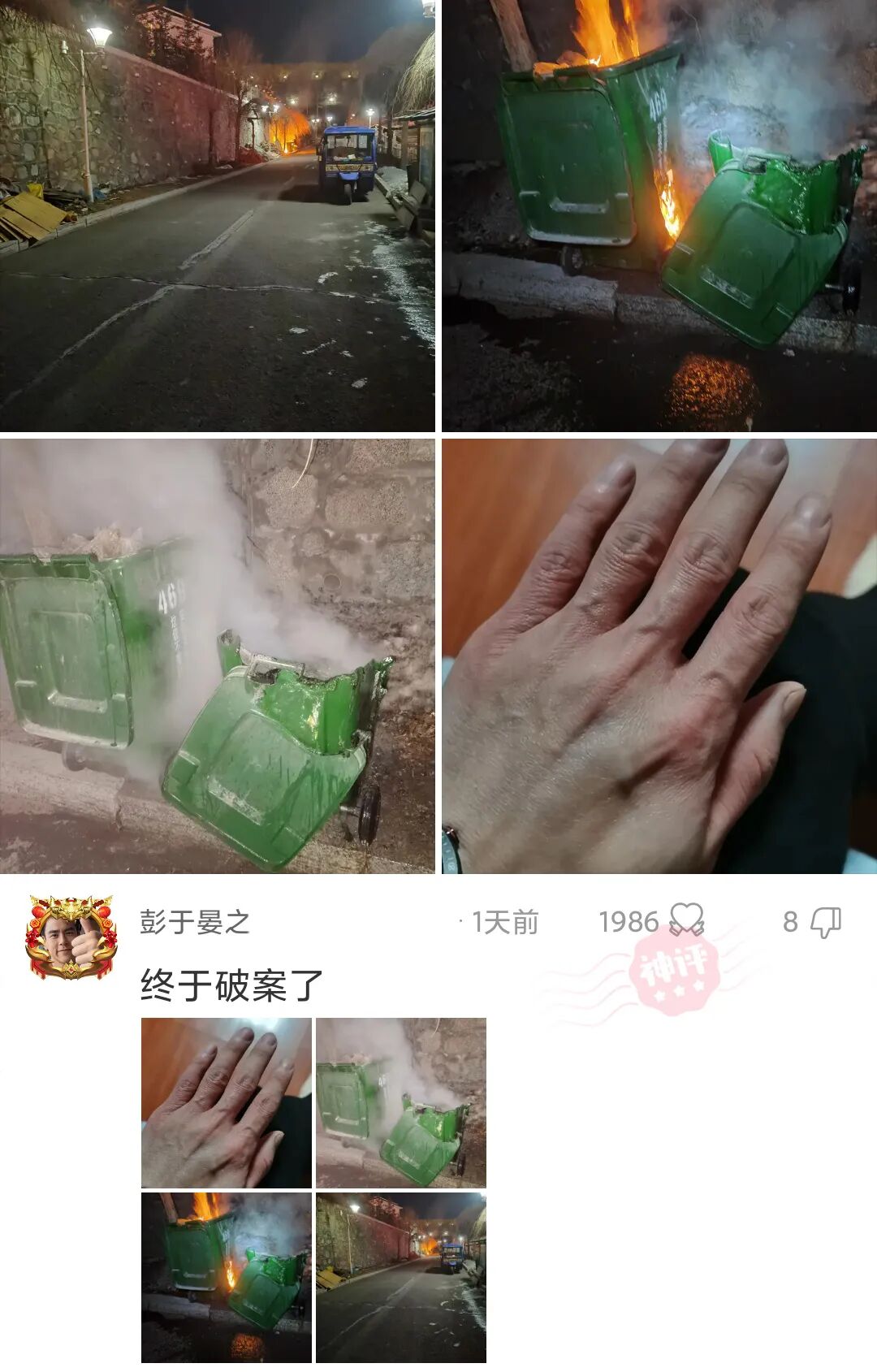 今天看见一个垃圾桶着火了,我上去就给扑灭了,手还给轻度的烧伤了,兄弟们,求表扬……