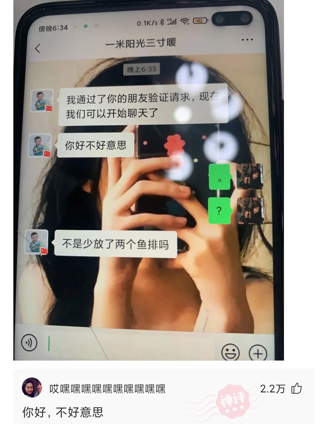 订个外卖少放了两个鱼排,商家说加微信退我钱,还说我好不好意思??