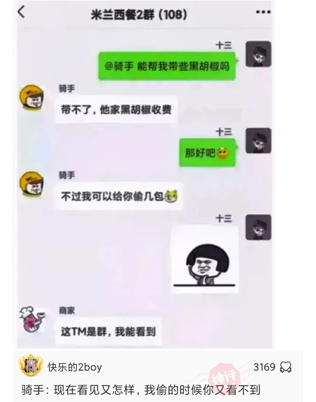 骑手:被发现了,不过不要紧,等会我帮你抢几包!