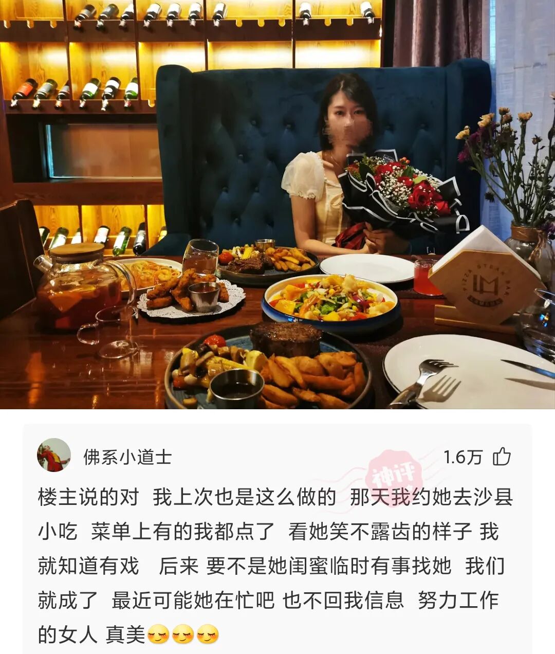 今日soul奔现成功,其实女生就是感性动物,你给她买个iPhone不如一束花加提前定好,从接上她到餐厅,进入餐厅是提前定好的远离人群的位子,所有的菜都是提前订好的,不用问她喜欢吃什么,只要知道她有没有忌口就好,女生就喜欢被安排的感觉。