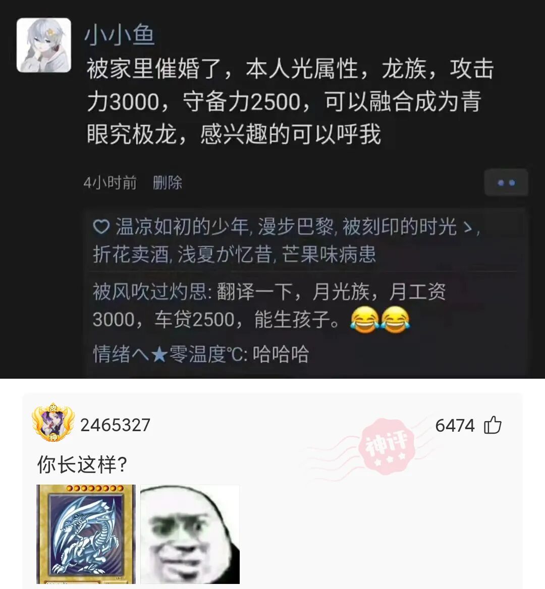 被家里催婚了,本人光属性,龙族,攻击力3000,守备力2500,可以融合成为青眼究极龙,感兴趣的可以呼我!
