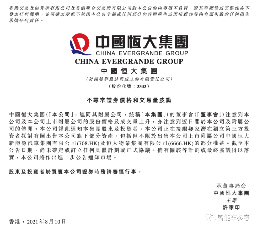 在中国恒大公开消息的同时,恒大汽车官方也发布公告,证实了恒大汽车出售计划。