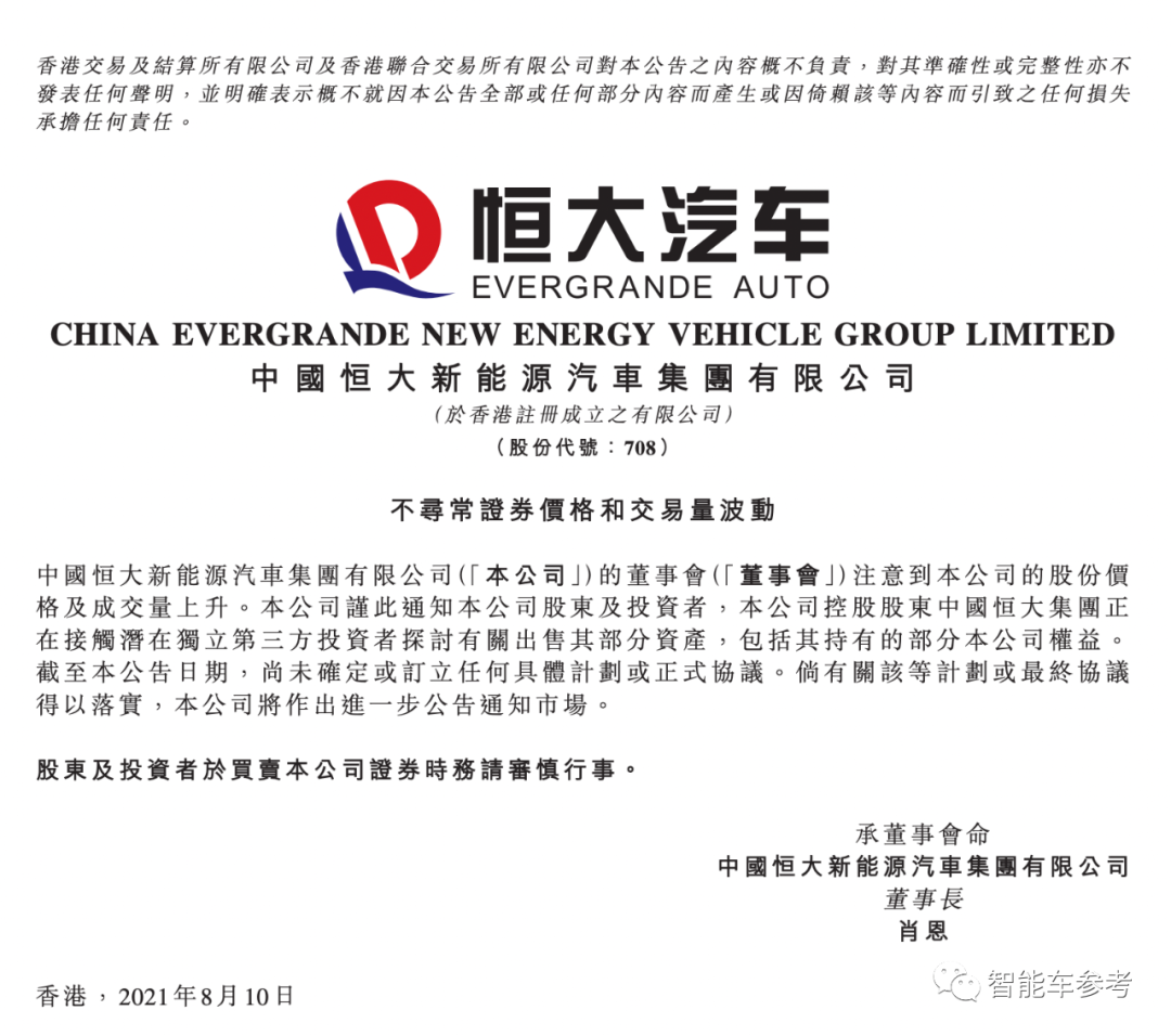8月10日晚间,中国恒大发布公告称,有意出售旗下恒大造车主体——恒大新能源汽车。