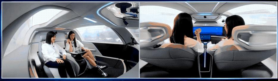 车内不设方向盘、踏板,且拥有超大曲面屏、智能控制台、变光玻璃、零重力座椅等智能化配置。