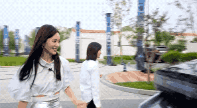 然后就求开得开,镜头一切,在分会场阿那亚,金晨小姐姐来遛汽车机器人了。