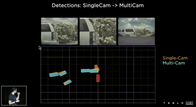 特斯拉方面还比较了多摄像头方案和单摄像头方案的差别,相同的场景下,单摄像头方案识别率明显低于多摄像头方案。