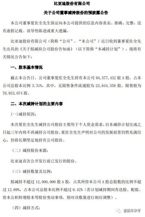 公告显示,夏佐全减持比亚迪不超过1200万股,占公司总股本比例不超过0.42%,减持金额约22亿元。