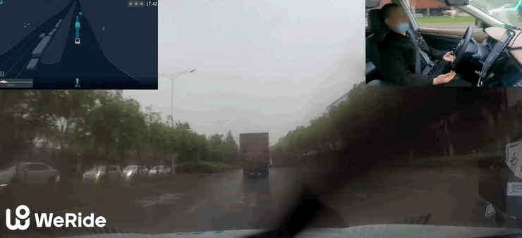 但在实测中,可以看到面对大货车不规范变道加塞,文远知行RoboTaxi的策略并不是激烈的刹停,而是有序减速,保持合理车距。