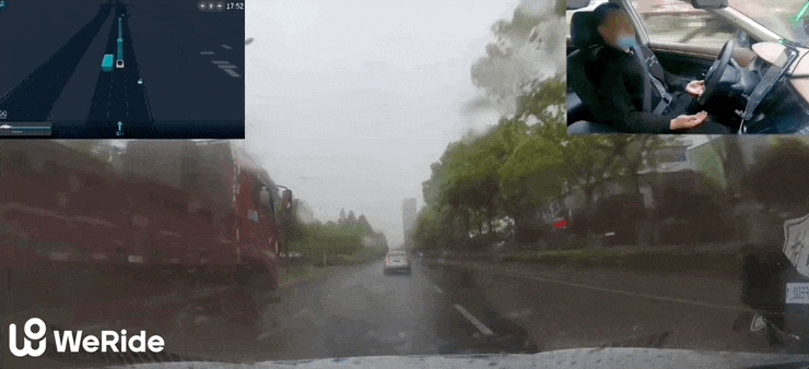 动图中的情况,是文远知行的Robotaxi在武汉经开区的公开测试路段上的实况录像。